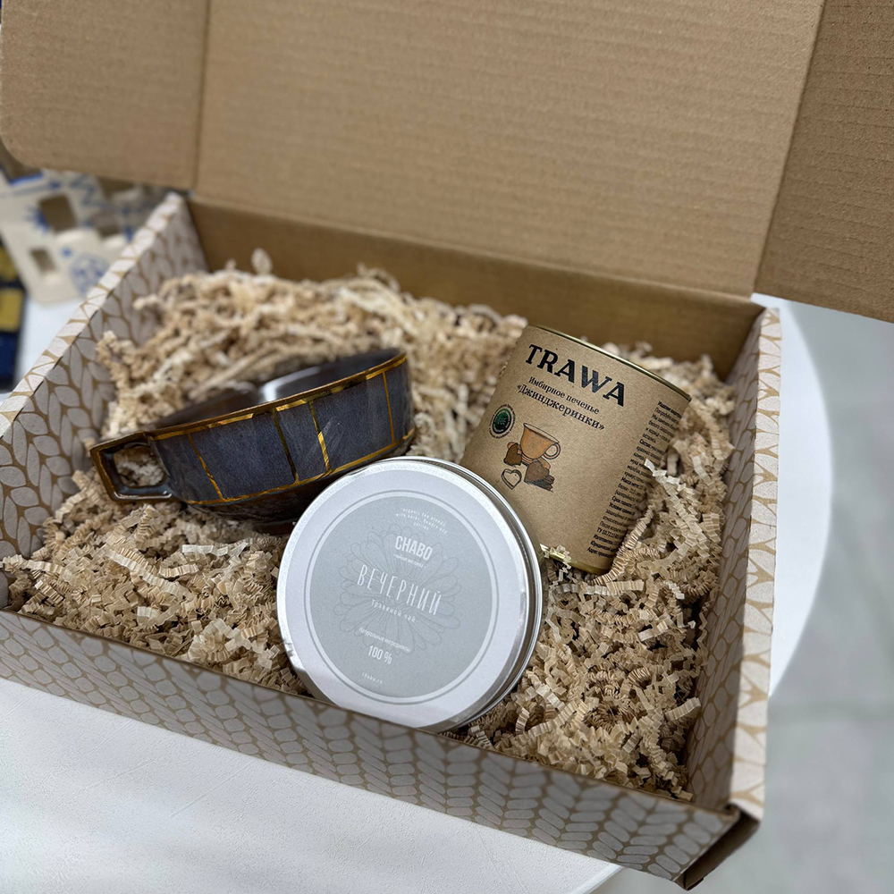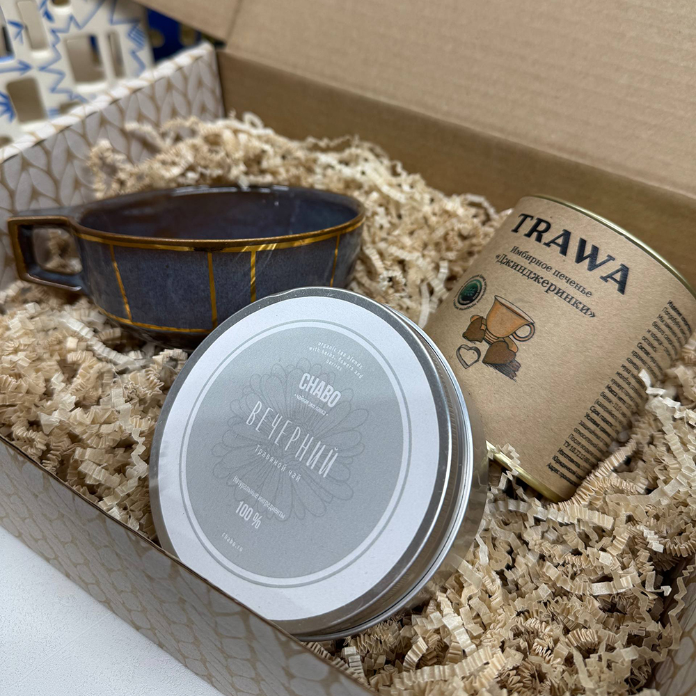 В набор входит: Кружка ручной работы широкая "Небо" с золотом 350 мл Fabrica; Чай "Вечерний" в банке Chabo; Имбирное печенье "Джинджеринки", 90 гр, Trawa; Подарочная упаковка и наша фирменная открытка!
